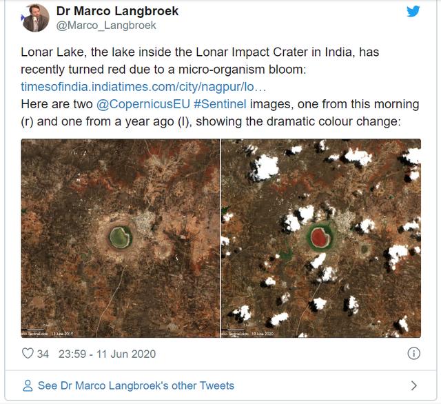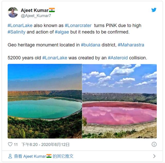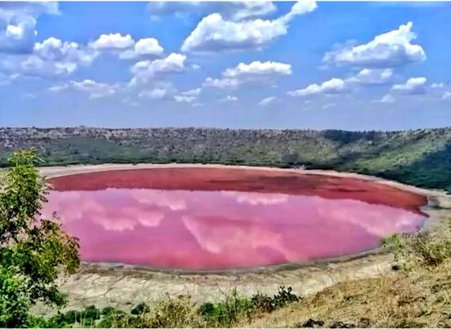 6月11日,印度天气频道的推特上突然爆出了一张照片,称洛纳尔湖在4天前突然从蓝绿色变成了婴儿粉红色!一时间印度民众纷纷猜测,因为此时正值印度国内疫情暴涨之际,累计确诊超过32万,每天新增1.1万,而当年被被湖水淹没的尚卡尔甘尼萨寺就在此处,这到底是个什么兆头?