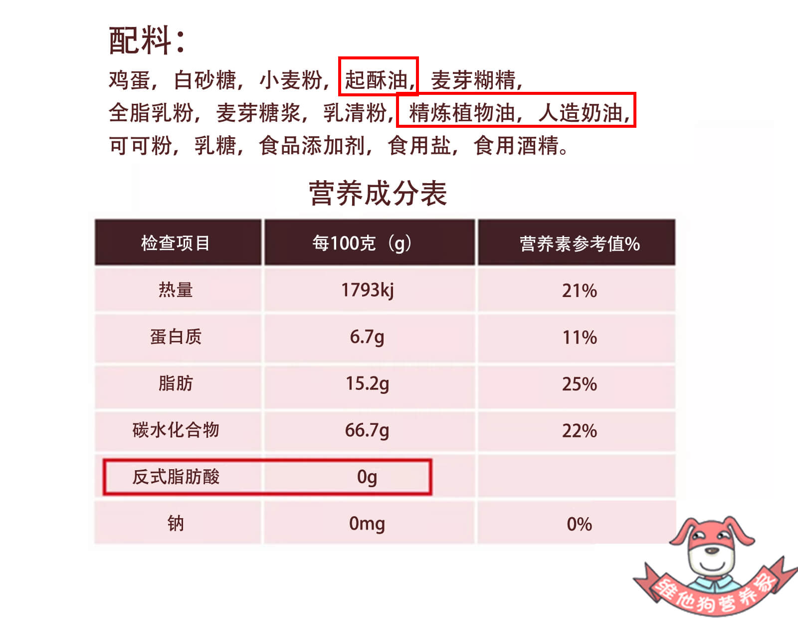 虽然营养成分中反式脂肪酸的含量为0克,但是我们在配料表中看到了起酥油、精炼植物油、人造奶油等,说明它还是含有反式脂肪酸的。
