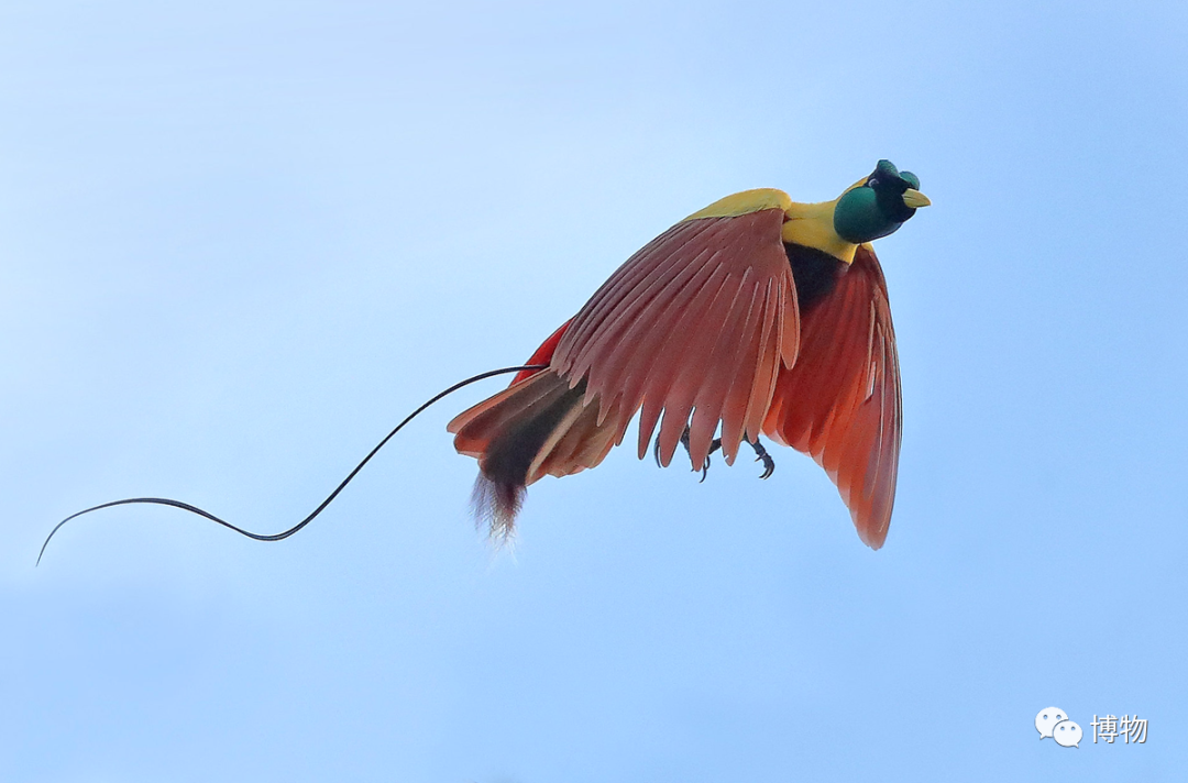 红极乐鸟在极乐鸟里算个小另类,它的炫耀工具是两个长长的“飘带”。