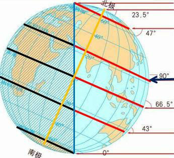 夏至日时正午太阳高度在地球北回归线及其以北地区达一年中的最大值,这天也是北半球一年中白昼最长、黑夜最短的一天。北回归线上的昼长大约15小时,夜长大约9小时。而北极地区一天24小时总是在太阳光的照射之下,太阳不会落下,所以出现极昼现象。而在南极附近,不管地球怎么自转,太阳光也照射不到。所以南极出现极夜。