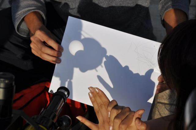 如果您来不及准备这类减光设备,也可以通过“小孔成像”的原理来观看这次日环食过程。准备两张白纸,在一张白纸上穿一个直径为五角硬币大小的圆形小孔,对着太阳,另一张放在小孔后面,使太阳光通过小孔在这张白纸上成像。这样我们就可以在这张白纸上看到日环食的变化过程了。