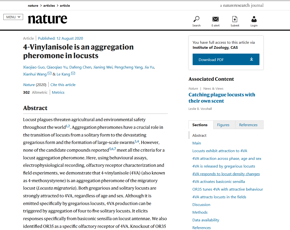 在人类历史上,蝗灾与旱灾、洪灾并称三大自然灾害,在全球造成了严重的农业和经济损失。尽管蝗灾与人类发展历史长期相伴,但是真正在科学上对蝗灾成因的认识不足百年。近日,中科院动物研究所康乐院士团队发现了一种蝗虫群聚信息素分子,揭示了蝗虫聚群成灾的奥秘。这一成果8月12日在国际学术期刊《自然》发表。