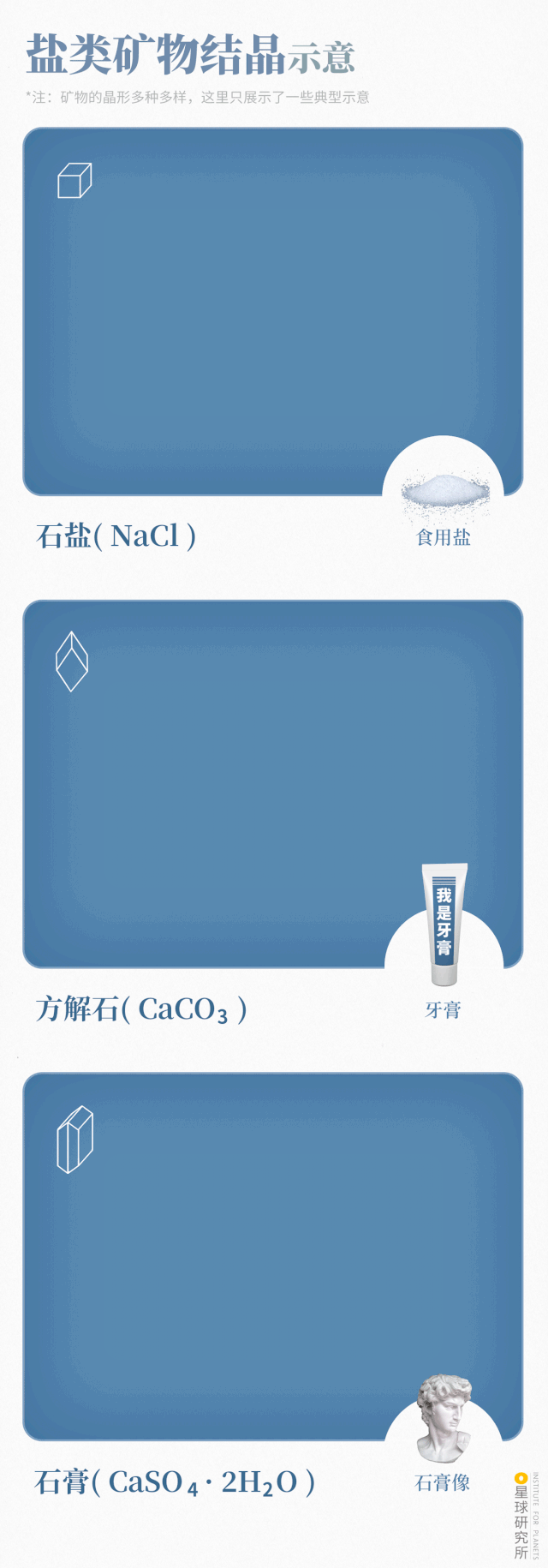 (盐类矿物结晶示意,制图@郑伯容&王哈勃/星球研究所)