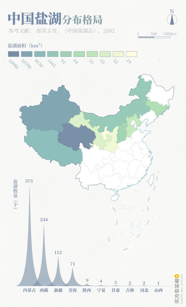 (中国盐湖分布格局,以上数据源自《中国盐湖志》,仅包含矿化度大于50g/L且面积大于1km²的盐湖,不同调查统计的湖泊情况会有所差异,黑龙江等省份也有小盐湖,制图@巩向杰&郑伯容/星球研究所)