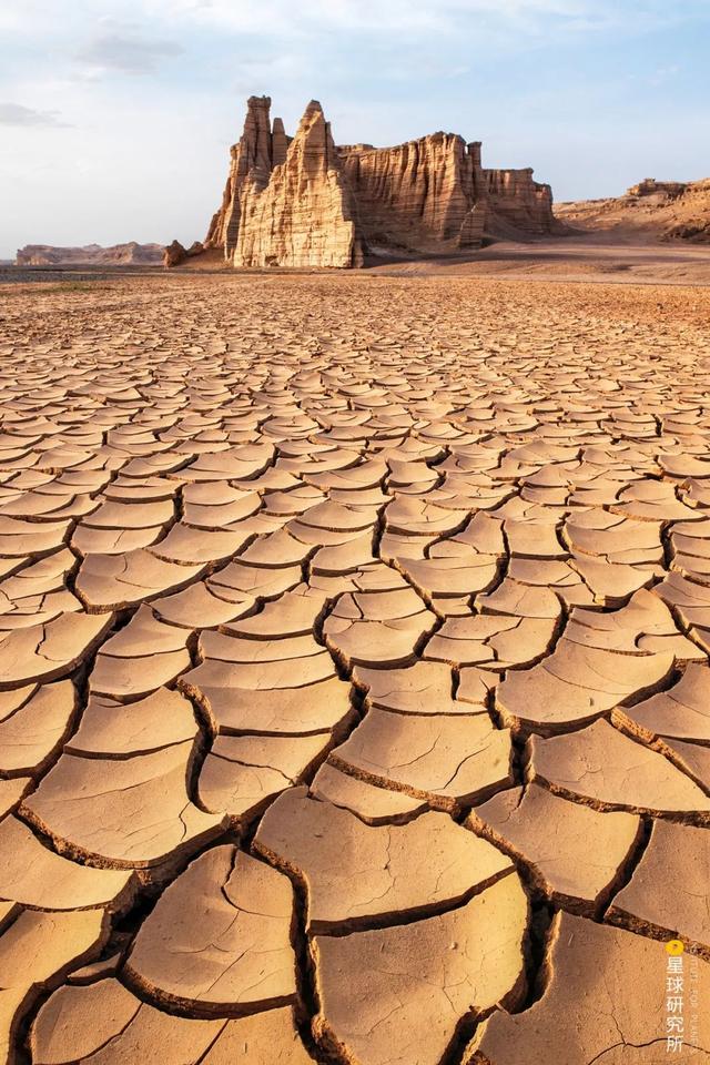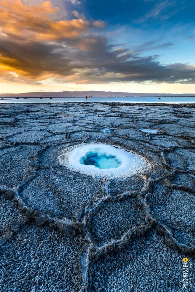 (青海柴达木盆地中的尕斯库勒湖,龟裂的盐壳上出现了一个盐溶洞,摄影师@姜鸿)