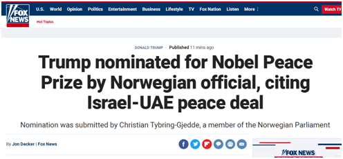 ●据福克斯消息,特朗普被挪威议会议员提名2021年诺贝尔和平奖。理由是参与斡旋以色列与阿联酋关系正常化。(来源:环球网)