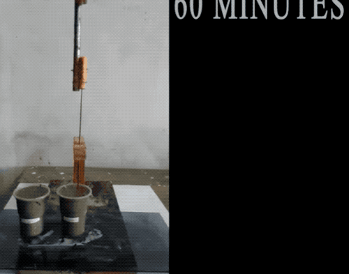 你可以清楚地看到,加入了糖以后,右边的水泥过了60分钟也没有变硬,而左边没有加糖的水泥已经硬化了,检测用的金属棍无法扎入——