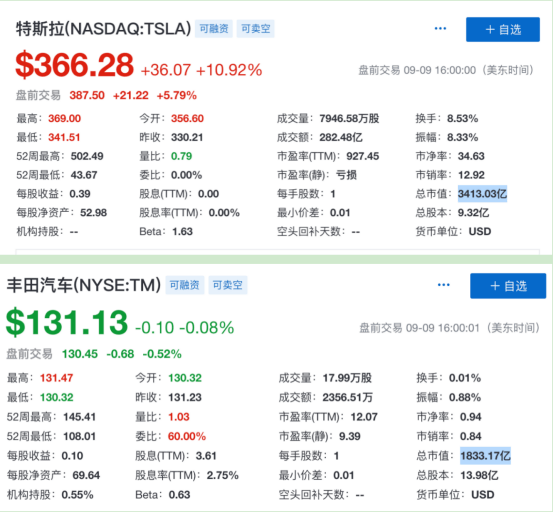 (雪球截图9月10日特斯拉与丰田汽车市值对比)