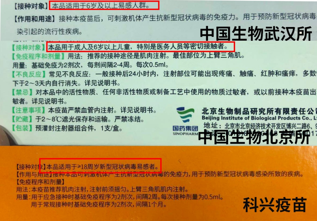 🟠国药集团中国生物技术股份有限公司旗下北京生物制品研究所生产的新型冠状病毒灭活疫苗(简称:中国生物北京所疫苗);🟠国药集团中国生物技术股份有限公司旗下武汉生物制品研究所生产的新型冠状病毒灭活疫苗(简称:中国生物武汉所疫苗);🟠科兴控股生物技术有限公司研制的新型冠状病毒灭活疫苗(简称:科兴疫苗)。从三款疫苗的包装盒上,能找到不少关键信息。