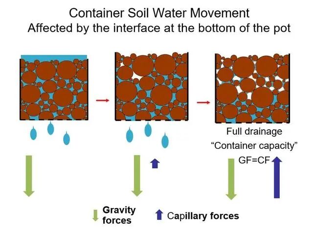 土壤通常由土壤颗粒、空气和水分组成,土壤之间的空隙称为土壤孔隙,是容纳土壤水分和空气的空间,也是植物根系伸展及动物、微生物活动的空间。越粗糙的土壤,孔隙越大,水就会跟随空气越快地流到花盆底部,然后从排水孔中排出;土壤越细腻,孔隙也越小,水流到底部的时间就越慢。你需要知道的是,水很难从孔隙小的介质流动到孔隙大的介质中,这是因为水对其自身和周围环境具有一定的“粘性”,颗粒较细的土壤比起粗糙的土壤来,由于与水分子的接触面更大,从而可以聚集起更多的水,在较细土壤的底部形成更深的饱和水柱。你在花盆底部放上一些石块,只是将饱和水柱区域向上移动了石头层的深度,而不会让水进入岩石缝里,这些水被称为地下的栖息水位,通过一个简单的类比你就能认识到这一点。你可以用一块方形的海绵来做实验。海绵是一种孔隙均匀的介质,你可以先将海绵平摊着放进水里,等它完全饱和后取出来,平摊在手上,你会发现海绵的水会慢慢浸出来。
