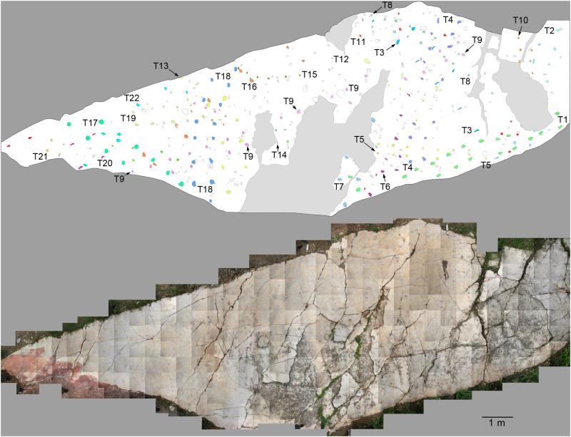 2017年夏,应贵州省博物馆邀请,中国地质大学(北京)遗迹学专家与德国同行等学者幺铺足迹点进行了多次考察,并进行了三维摄影,分布图绘制与细致测量。根据地质调查的资料,这批足迹化石组合保存在幺铺镇红龙村中三叠统安尼阶关岭组松子坎段的薄至中厚层泥质白云岩的层面上。关岭组是分布在中国西南地区的中三叠统地层,从下至上可分为松子坎段和狮子山段,其中上段曾产出了著名的罗平生物群——包括丰富的鱼化石和海生爬行动物骨骼、节肢动物和棘皮、双壳、腹足、腕足和菊石等无脊椎动物化石以及植物化石群。足迹点区域关岭组松子坎段为灰色和浅灰色薄至中厚层白云岩、灰岩与白云质灰岩和泥质灰岩互层,被第四系黄褐色和灰黑色粘土、粉质粘土及砾石所覆盖,富含双壳化石,属于泻湖或浅海沉积。