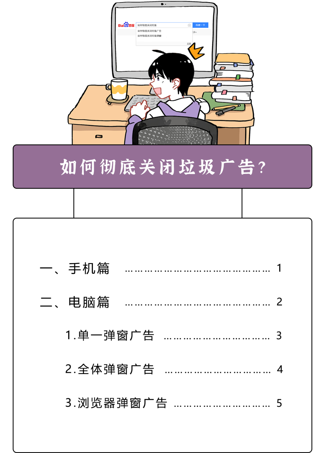事情是这样的嗯弹窗广告都碰到过吧我知道的甚至有人偷偷还点了不过要是旁边突然出现一个人特别是长辈啥的就很容易引起误会啊所以为了避免这种情况今天就给大家介绍几种上手容易而且简单实用连电脑白痴都能轻松学会的方法手机类型太多了我就挑几个常见的品牌来说了首先是系统广告在[设置]→[更多设置]→[系统安全]里把这两个都关掉然后点[广告服务]把这个也关了还有就是应用广告这个就比较多你们点进每个[系统应用设置]里把列表拉到最底下像是应用商店、音乐、日历、天气这些的都有个类似叫[内容推荐]的记得全都关掉华为和小米操作上比较相似你们打开[设置]→[隐私]→[广告与隐私]和[设置]→[系统和更新]→[系统安全] 把这些都关了就行其他系统软件的广告一样的我就不讲了一般而言苹果手机的广告比较少但也是有广告窗口的在[设置]→[隐私]的最底下有个[广告]选项把[限制广告跟踪]点上就行了哦对了苹果手机的广告推送貌似是按照我们浏览习惯来的所以要是我们不去看广告广告大概会少一点的意思?这个我不确定我没有试验过总之不管是啥手机关闭广告的选项一般都在列表的最底下你们要无聊随便拉到底找找看没准能找到如果遇到下面这种弹窗广告你只点[近期不再显示]是没啥用的最多得到些心理安慰正确的做法是先别急着关掉它没有让你好好观察它甚至点开它的意思在键盘上同时按下[Ctrl+Alt+Delete]打开任务管理器哦Win10的同学也可以直接右击[任务栏]找到任务管理器 在[应用程序]或者[后台进程]中找到广告程序右击[打开文件所在的位置]把整个文件夹统统删掉就行了不过有些软件是有修复机制的没过两天这个文件夹就又会出现了所以我们只好用一招「偷梁换柱」把原先的广告程序给替换掉如果不想这么麻烦一个个屏蔽的你们可以试试这样依次打开电脑的[控制面板]→[网络和Internet]然后点击[Internet选项]→[隐私]把[启用弹出窗口阻止程序]点上然后点旁边设置选择最高阻止级别还有一种方法右击桌面上的[此电脑]然后点[管理]找到[系统工具]→[任务计划程序]→[任务计划程序库]把右边出现的信息全部右击[禁用] 如果上面的办法都不太行的话或者一个都学不会你们可以去下个电脑管家啥的基本都有拦截广告的功能不过要注意有些软件是不会屏蔽自家广告的这个比较麻烦好评度比较高的一款软件叫「火绒」你们可以去试试图我就不放了不然你们又说我像广告哦对了经常用浏览器的同学有时候打开网页不是会跳出这种界面嘛 或者右下角会有关闭按钮很模糊的广告 你们点开浏览器设置会有「屏蔽弹窗广告」按钮把它点上每个浏览器具体操作都不大一样我就不展开讲了不过你们懂的这只能起到部分作用该有的还是有的所以建议你们下一个叫「Adblock」的浏览器插件有些粉丝可能没用过浏览器插件我仔细跟你们讲讲我就拿chrome浏览器来举例好的我讲完了差不多所有实用的小方法都在这了没看懂的粉丝可以先收藏万一哪天智商突然上线呢哦或者有男朋友的转发给他!让他学会来帮你弄来源:一只学霸