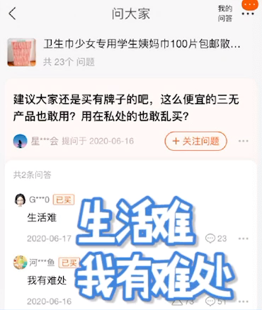 前一段时间散装卫生巾成了社交网络的热门话题,20多块一百片,而且很多人买。买过的人留言说:“我有难处。”