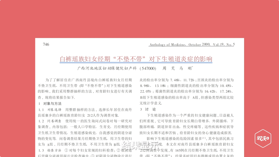 我查到了一份调研报告,这是2000年广西河池地区妇幼保健院妇产科对当地妇女的调研,结果显示,使用卫生纸、卫生带等代用品的妇女,下生殖道感染的检出率为43. 28%,连代用品都没有的,感染高达为 64. 14% 。