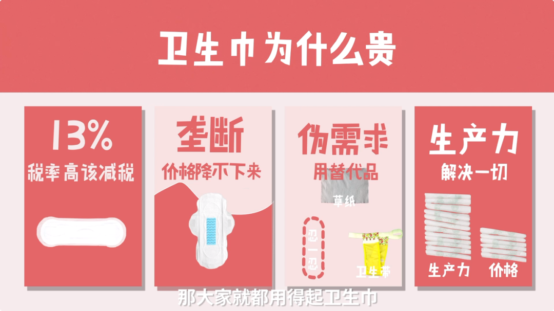 有人提出,我国卫生巾有13%的税率,可以通过减税来帮助女性买到更廉价的卫生巾;有人说不对,卫生巾贵是因为大企业垄断,价格降不下来;有人说卫生巾那都是消费主义制造的伪需求,你们怎么不能用草纸、用可以反复手洗的棉布月经带啊?还有人说你们说的都不对,根本办法是发展生产星辰大海,大家都用得起卫生巾。