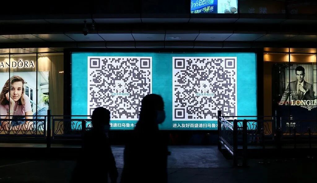 疫情过后,新疆乌鲁木齐市商贸服务企业有序恢复营业。目前,市民如进入一些商超、公园、车站等场所,需扫畅行码、测量体温。上图为乌鲁木齐一家商场门口大屏幕显示的畅行码。