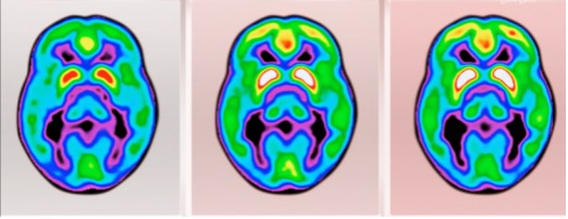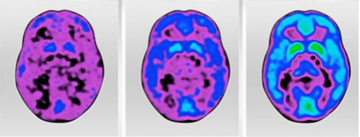 我们提到的第一个阶段,也即是Aβ的堆积,在40岁的时候就已经开始。这是一位遗传型病人从40到80岁的头部扫描,我们在40岁的扫描中已经能清楚地看到Aβ蛋白的堆积(蓝色区域),