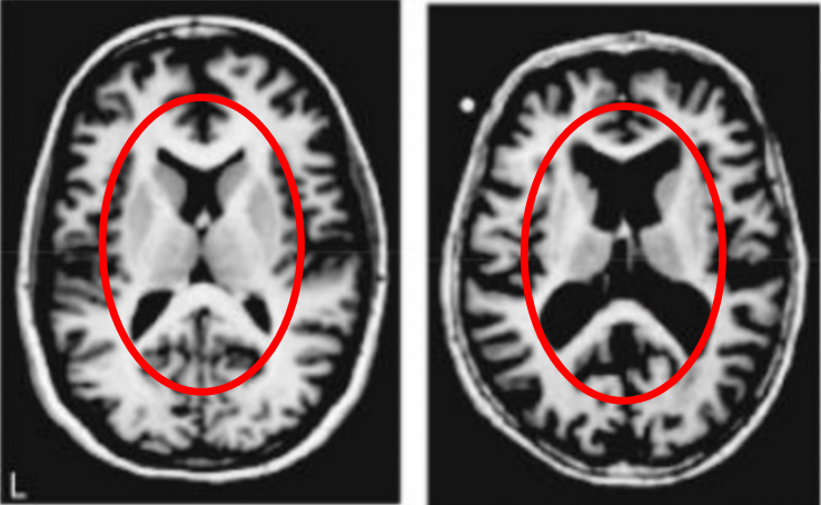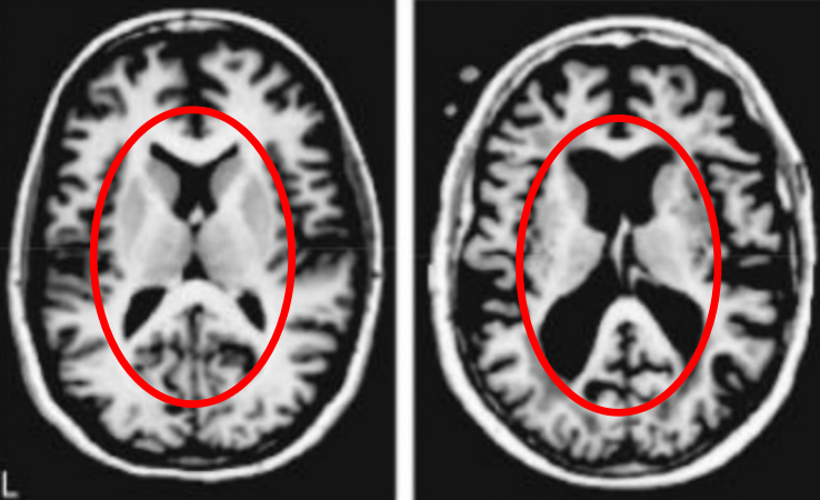 下图中有两张磁共振成像,左侧是年轻人的大脑,右侧是健康老人的大脑。从黑色面积的增加我们能清楚地看到脑组织的萎缩。