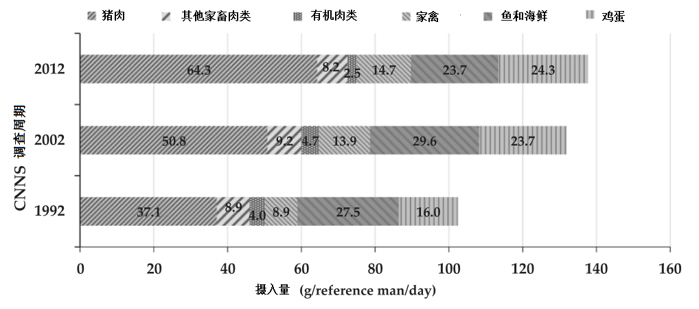 从1982年到2012年,中国动物性食品的平均摄入量继续大幅增加,从52.6克/天增加到137.7克/天,尤其是猪肉的摄入量远远超出建议,从37.1克/天增加到64.3克/天,增长73%。49.9%的国人吃的畜禽已经超过了指南的推荐量。