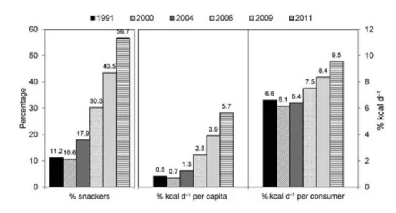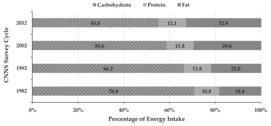 其中脂肪供能比例从1982年的18.4%上升到2012年的32.9%。碳水化合物摄入能量的比例从70.8%下降到55.0%。