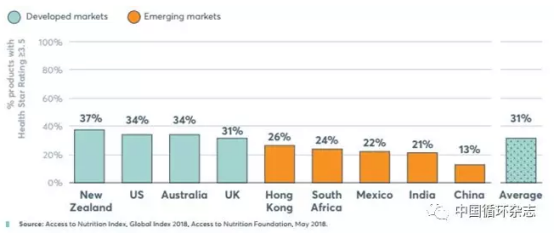 图4 不同国家和地区包装食品健康之星评级≥3.5(健康门槛)的比例