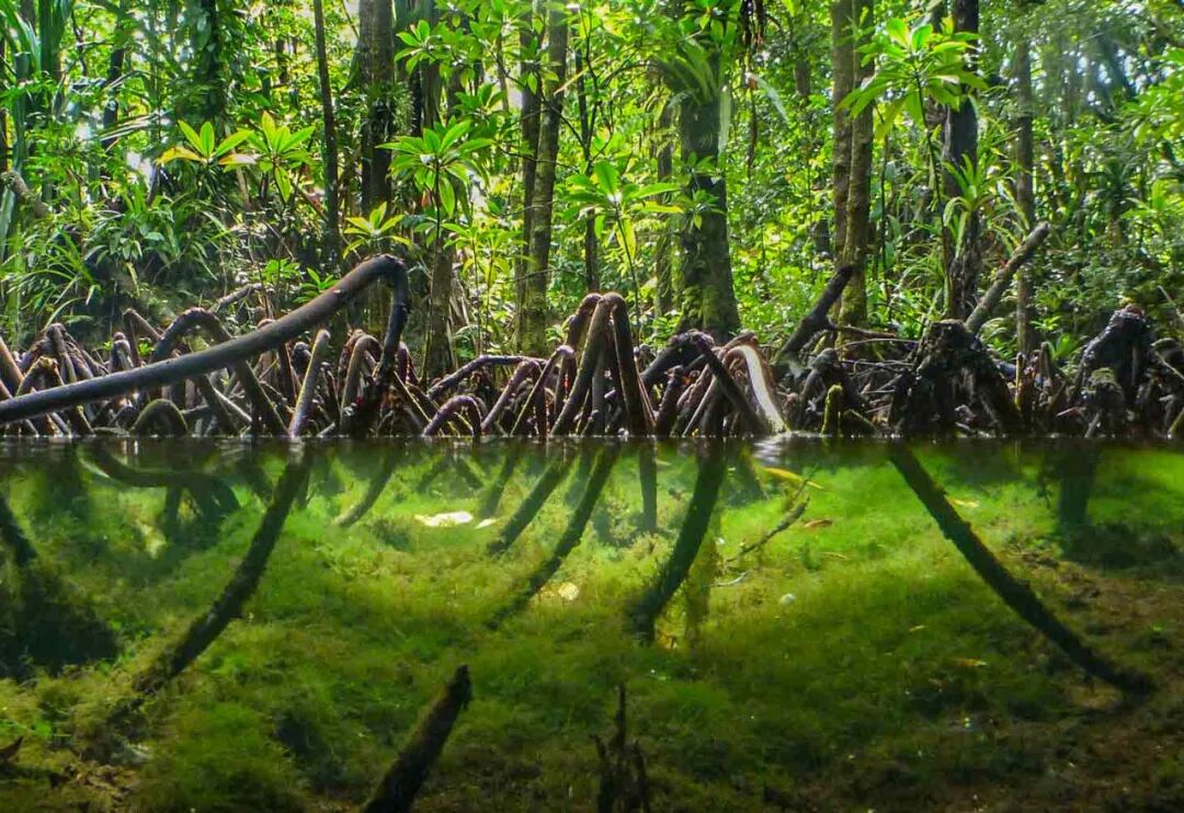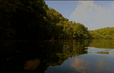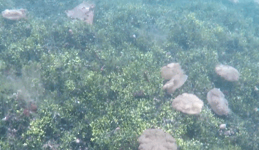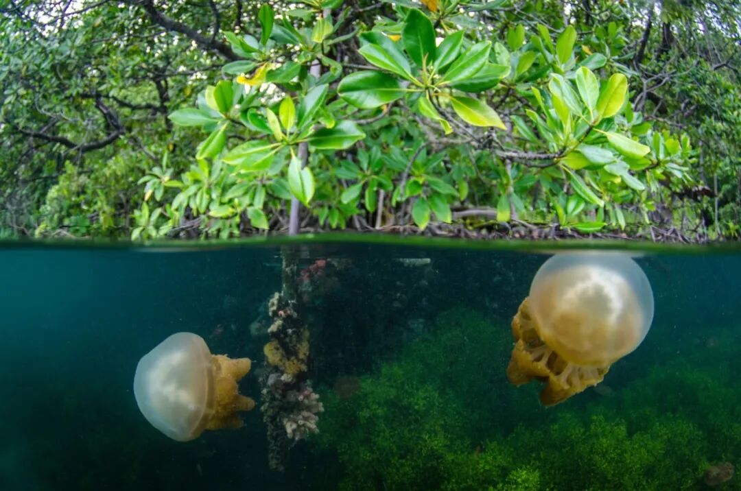 在红树林边上能发现倒立水母(Upside-down jellyfish,Cassiopea Ornata),它们触手朝上,很喜欢和藻类在一起,而且几乎不移动就获取尽可能多的阳光。