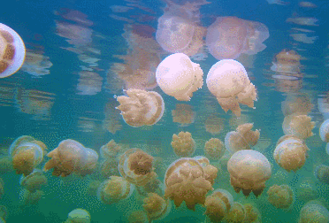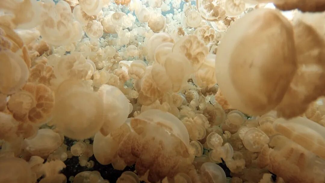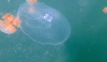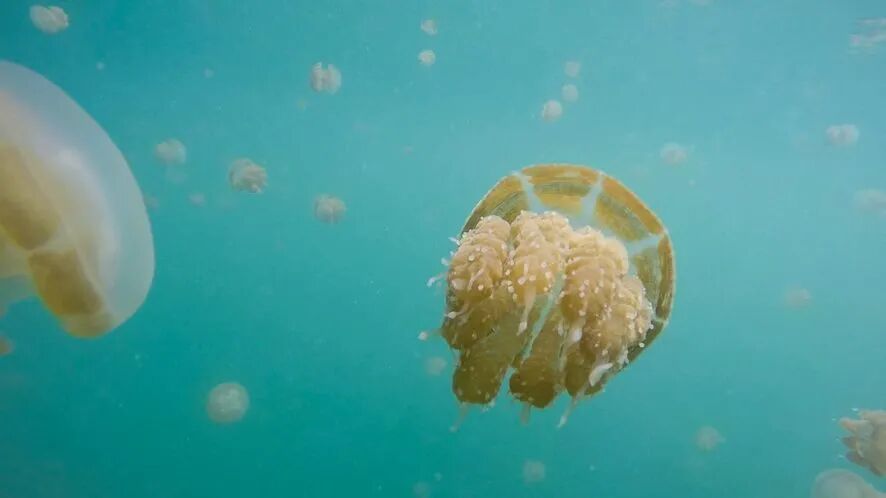 湖中最多的是珍珠水母(Spotted Jellyfish,Mastigias papua),但是这里的品种和菲律宾的不同,触手更短,更像是黄金水母。其次是海月水母(Moon Jellyfish,Aurelia Aurita),大概30厘米左右,基本上透明,并随水流而漂移,比较难以发现。