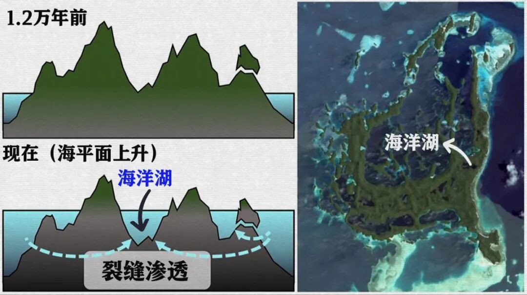 帕劳海洋湖的形成,右图所示位置为目前开放的水母湖