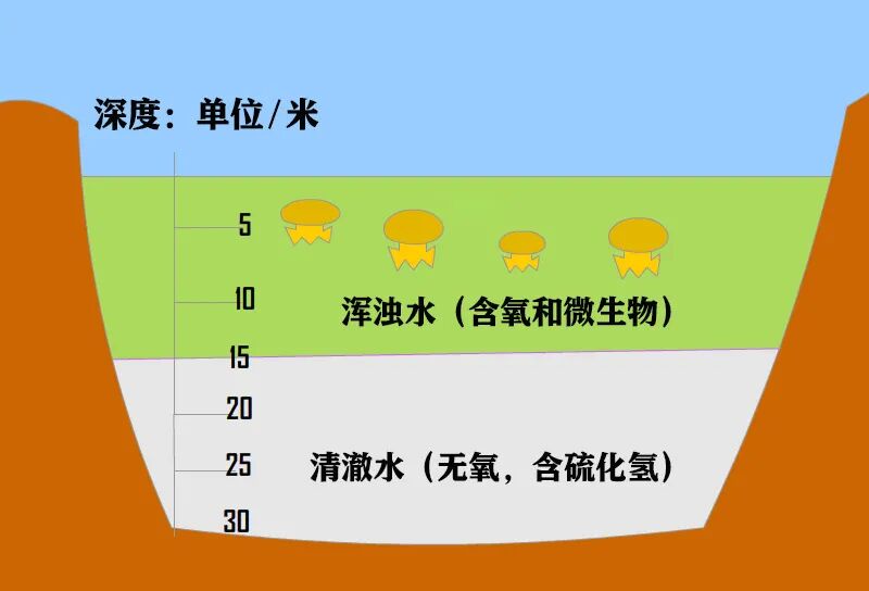 下面的缺氧层却包含了大量的有机物分解的营养物质,比如氮和磷,这是植物的最爱,所以靠藻类生活的水母为了保持共生藻类的健康,必须到缺氧层去让藻类吸收“肥料”