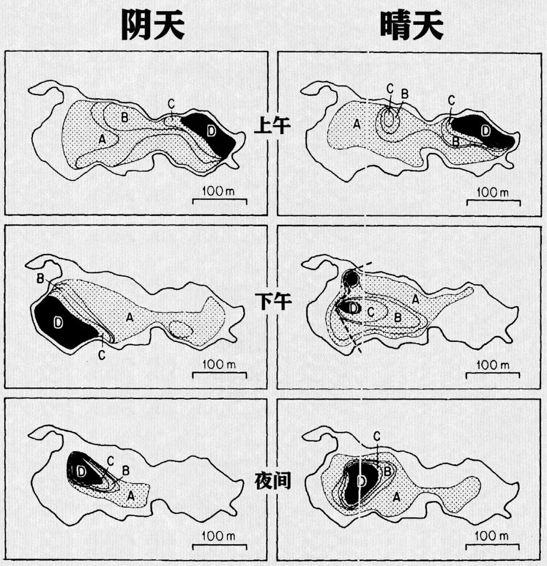 水母湖在不同时间的水母聚集图示意。可见无论天气如何,整体趋势不变,只是在天晴阳光充足的时候,水母在正午时会更分散,以便照射到更多的阳光。