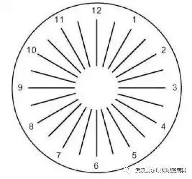 摘下眼镜,注视下图,如果发现图中某条直线比其他更粗或者更黑,则提示可能存在散光。如果所有直线都粗细分布均匀,则没有散光或散光度数小。