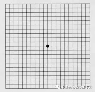 隔上图30厘米,遮住一只眼睛,并注视图中央黑点。如果发现图片中心有黑影,或者直线变弯,那说明黄斑可能出了问题,如下图所示: