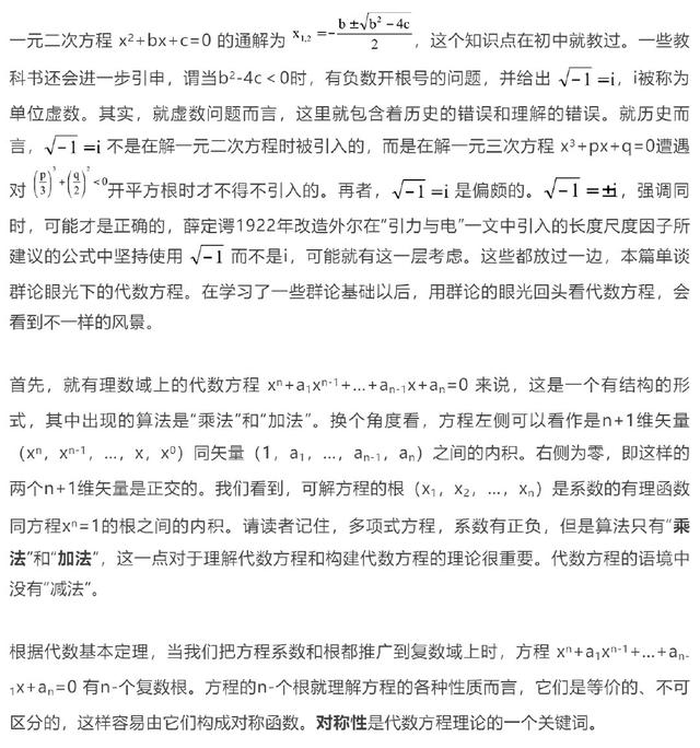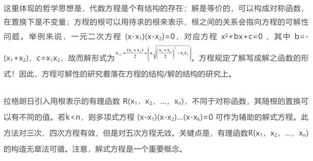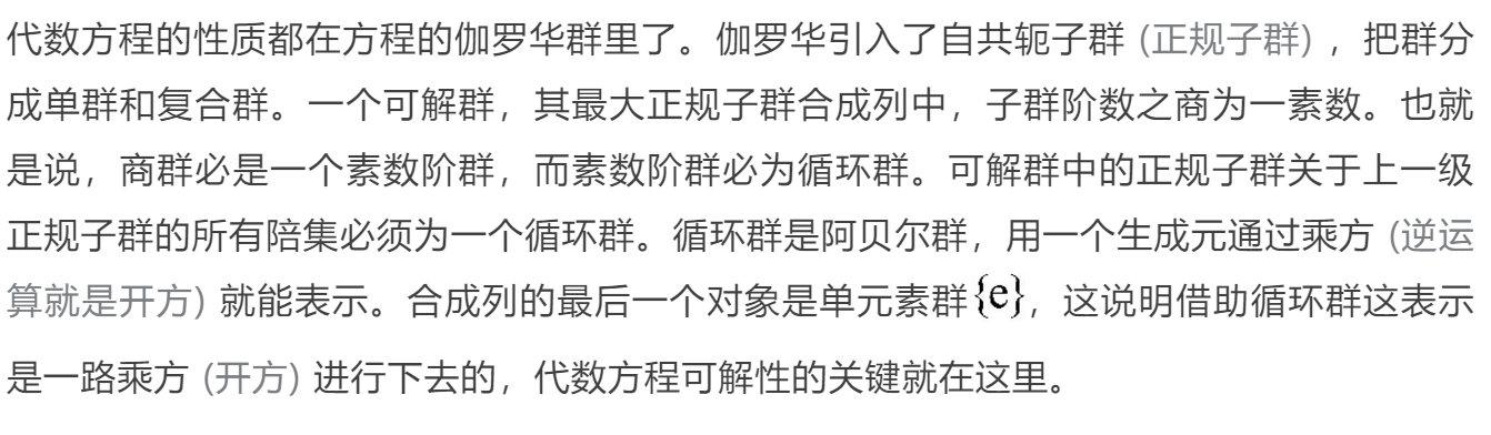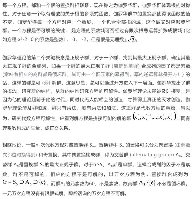 1826年,阿贝尔宣称不是所有的五次方程都有有限根式解。阿贝尔发现,能用根式求解的代数方程 (其实就是二次、三次和四次方程),根的根式解表达都是方程系数和单位根凑成的有理函数。伽罗华把方程可解性的问题转化为具体方程的置换群及其子群结构的问题。笔者以为,应该是“有限根式意味着什么”的问题。紧接着的伽罗华理论宣称,一个代数方程有有限根式解,当且仅当它的伽罗华群是可解的。