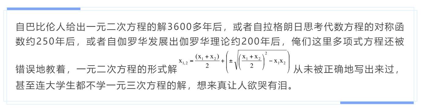 自巴比伦人给出一元二次方程解3600多年后,或者自拉格朗日思考代数方程对称函数约250年后,或者自伽罗华发展出伽罗华理论约200年后,多项式方程还被错误地教着,一元二次方程的解从未被正确地写出来过,甚至连大学生都不学一元三次方程的解,想来真让人欲哭有泪。