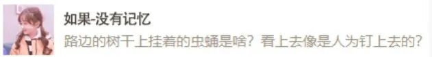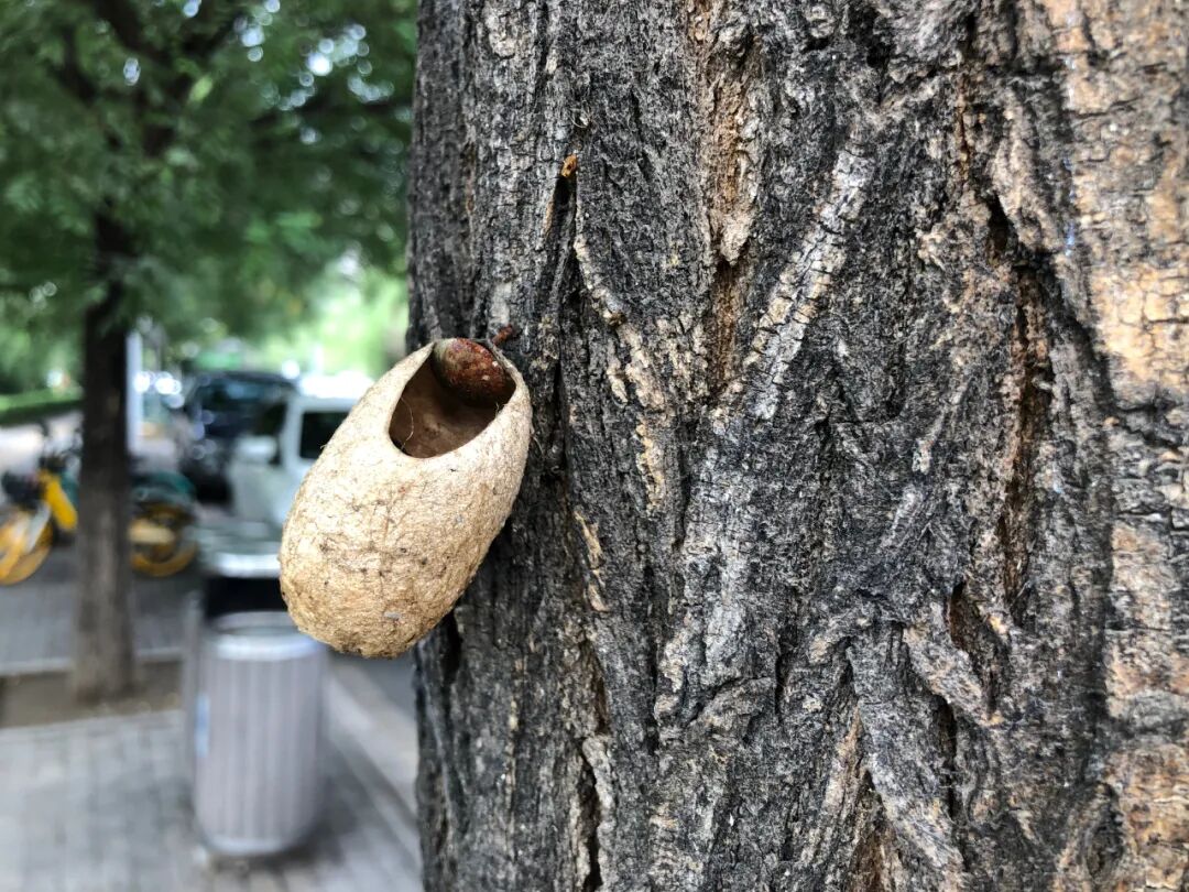 路边的树干上挂着的虫蛹是啥?看上去像是人为钉上去的?