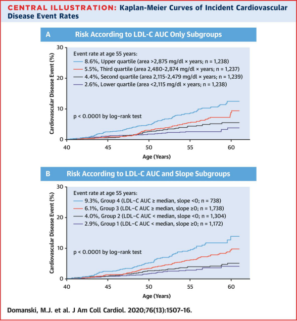 发表在JACC上的这项研究,对CARDIA研究中1985~1986年入组的18~30岁4958位无症状成人的资料进行了分析,参与者平均年龄25岁,平均坏胆固醇为111 mg/dl。在参与者40岁后中位随访16年期间,有275人发生心血管事件。