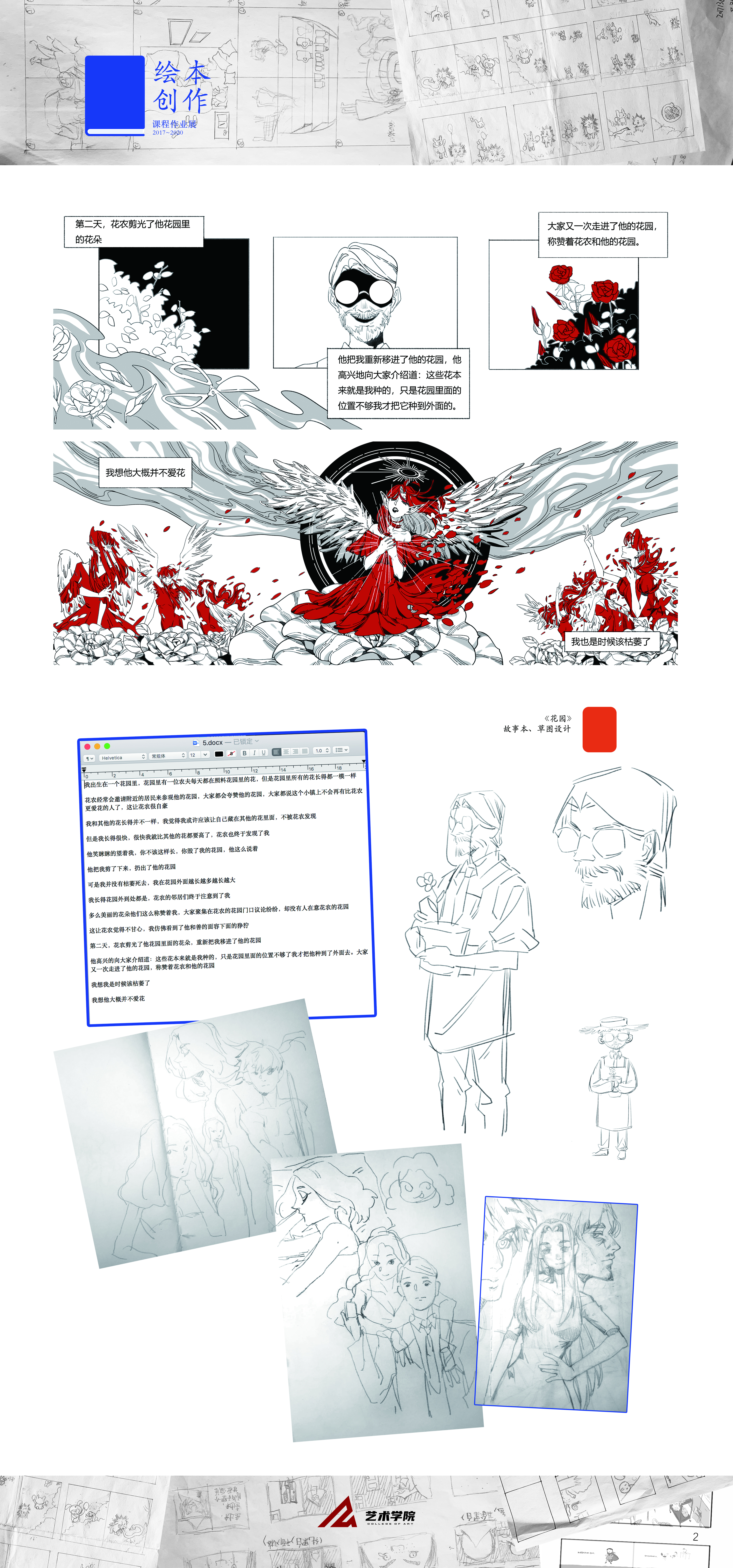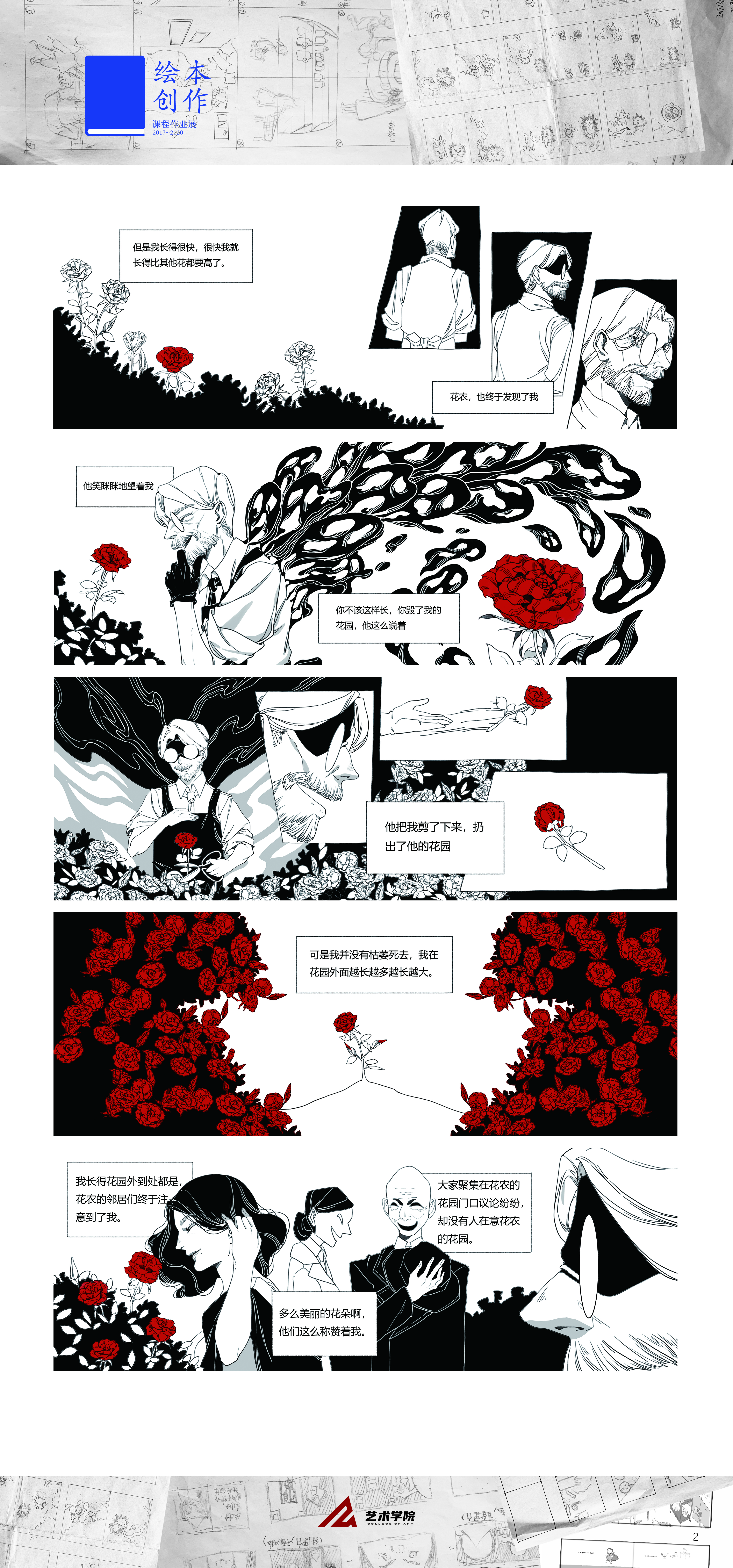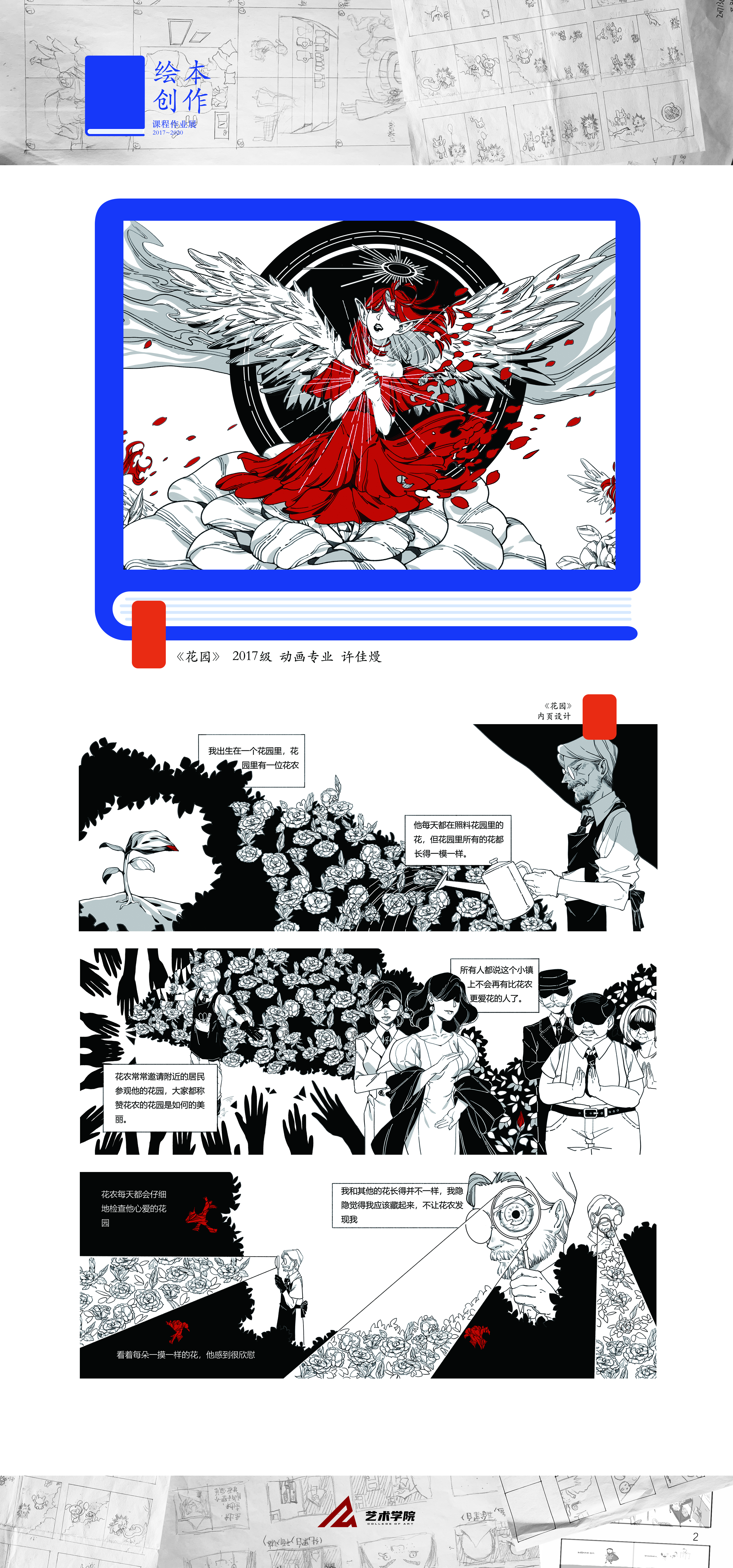 绘本《花园》讲述了这样一个故事:这个世界上一些人做好事只是为了别人的赞誉,而并非真正的做好事,但他们往往能蒙骗到大多数的人,并让他们盲目地跟风赞美,到最后受伤的却是无辜者。作品采用电脑CG绘画,参考了美式漫画与日式黑白漫画两种表现风格的特点。