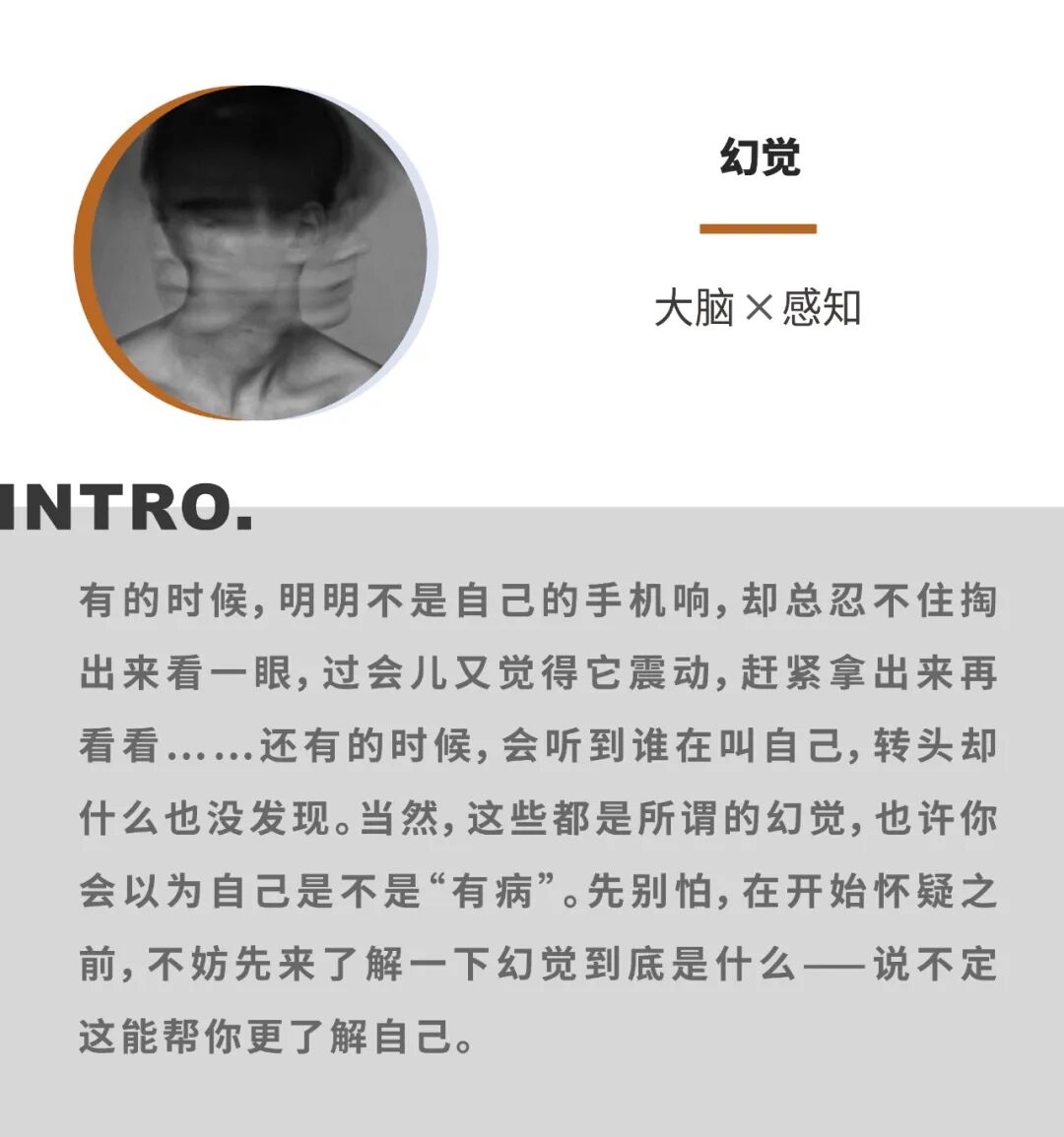 视幻觉、幻听、嗅幻觉、味幻觉或者触幻觉……每一种感觉都可能会有某种形式的幻觉,因为这些现象从根本上来说其实是“幽灵感觉”——并没有实际外部刺激的情况下的“对刺激的反应”。