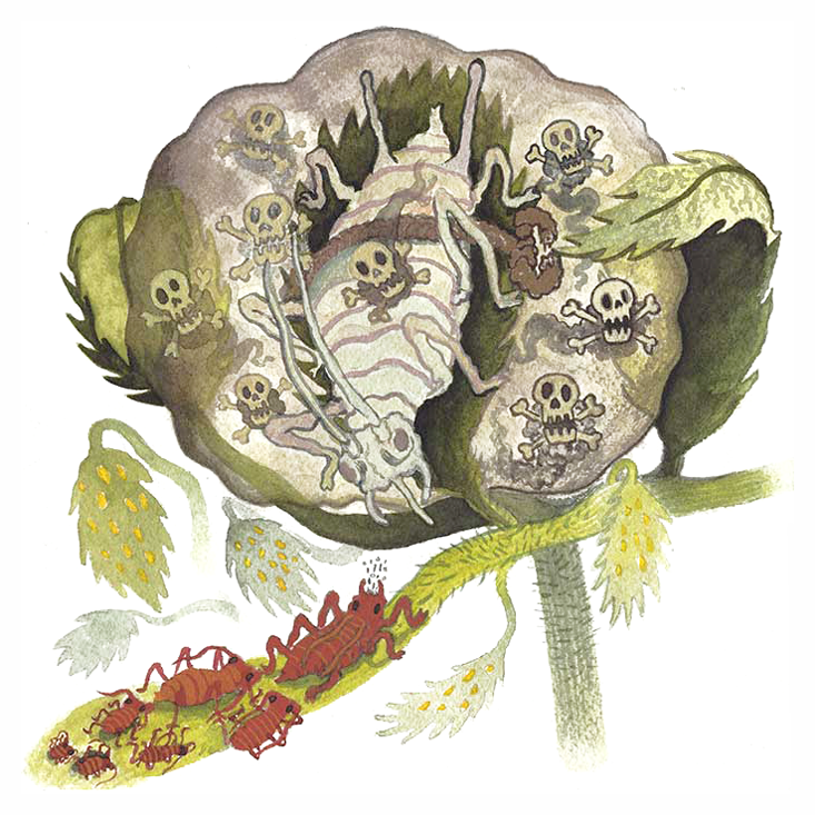战争中最引人注目的总是那些更大更强的“大杀器”,人们总是更容易先关注坦克、飞机、舰船的较量,同理,在漫长的进化战争中,巨兽之间为抢夺顶部生态位的竞争也最容易被关注。可是生物进化的战争不止有横向的两强相争,纵向的攻防博弈也无敌有趣。和我们两脚兽的世界相比,植物的生活似乎有些平淡而无趣,但只要你用心观察,就会发现在它们的死对头昆虫的贪婪蚕食下,植物的进化就是一场生存反击之战。不会动的植物也能战斗吗?它们显然已经进化出了不少基于化学的防御手段。当然,就像游泳和跑步不能兼得一样,这些防御手段也需要付出额外的能量和营养,这些资源原本可以用于它们的生长和修复,因此,为了平衡发展,植物们必须有所取舍,从它们的化学武器库里挑选个别趁手的兵器。下面就介绍其中的五种备受昆虫谴责的化学手段——警报、结盟、陷阱、间谍、急救。与其7天24小时全天候准备好武器,显然遭受攻击后再紧急出动会是一个减少浪费的办法。一旦昆虫叮咬啃食了叶片,叶片就会发出警报,释放出一种挥发性物质,类似于信号弹“一支穿云箭,千军万马来相见”的作用,植物的其他部分甚至是邻居也都会开始戒备,抵御进一步的昆虫攻势。这个预警系统通过一连串的分子事件发挥作用。首先是触发茉莉酮酸的释放,这种物质能够分解为一类名为JAZ的蛋白质,而后者可以抑制植物体内各种有毒和保护性化学物质的基因表达,JAZ蛋白被清除,大规模杀伤性化学武器开始生产。有些植物还会利用地下“情报网络”来向周围的同类发送警报。植物会与土壤中的真菌形成共生关系,真菌能穿透植物根部的表层,通过偷取植物的碳水化合物为生,同时会帮助植物摄取氮磷等重要养分作为回报。真菌会长出细长的菌丝,覆盖周边的植物,形成巨大的地下网络。在一项针对豆类植物的实验中,研究人员将蚜虫放置在一株套在塑料袋的植物上,由于塑料袋阻隔了空气,使其无法通过挥发性物质发出警报,但由于地下真菌网络的存在,通过菌丝与之相连的植物也开始释放防御性化合物。真菌在这场植物与昆虫的战争中大概充当了一个地下情报机构的角色。
