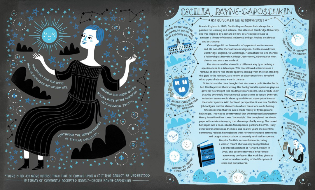 美国作家瑞秋·伊格诺托夫斯基(Rachel Ignotofsky)在《无所畏惧:影响世界历史的50位女科学家》(Women in Science: 50 Fearless Pioneers Who Changed the World)中介绍了塞西莉亚。| 参考资料[6])
