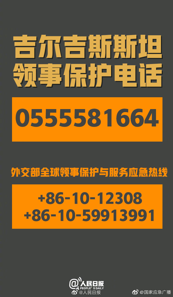 10月5日以来,吉首都比什凯克等地发生因国家议会选举引发的系列事件,形势还在继续发展。中国驻吉使馆提醒在吉同胞关注当地安全形势,增强自我防护意识,尽量减少不必要外出,做好自身安全和应急准备工作。必要时,请通过领事保护电话(0555581664)与我馆保持联系。