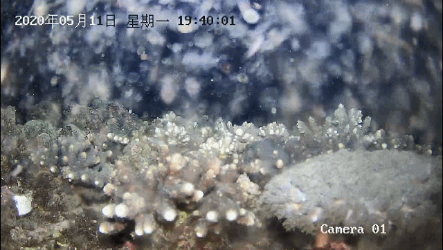 水下摄像机捕捉到疑似珊瑚排卵的镜头,经潜水员确认后发现它们是霜鹿角珊瑚的宝宝 | 广东海洋大学深圳研究院