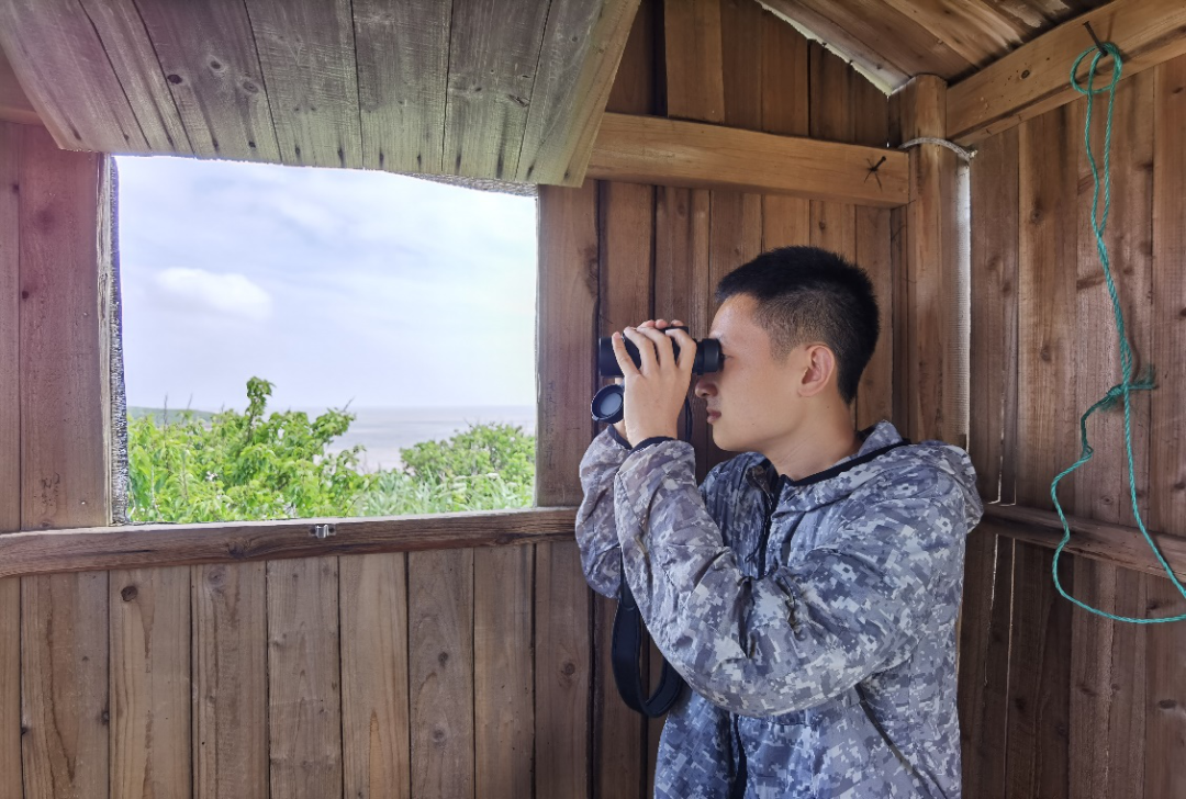 2020年的一名驻岛人员王进杰正在用望远镜观察鸟群的活动 | 丁鹏拍摄