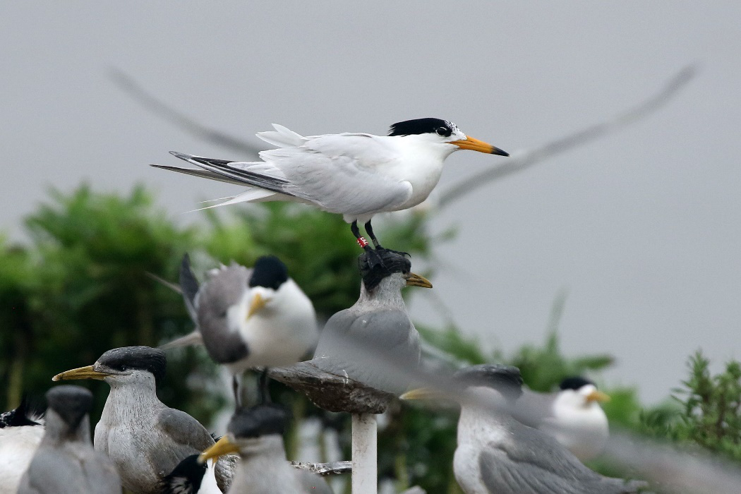 一只中华凤头燕鸥,正站在 “人造燕鸥”脑袋上 | 丁鹏拍摄