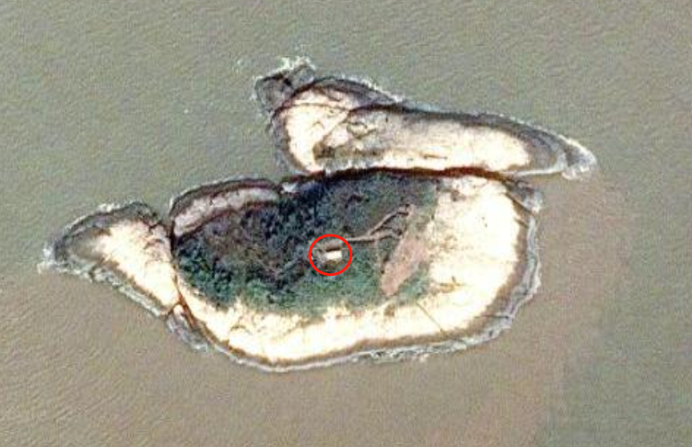 俯瞰铁墩岛,好似一只正在休憩的水鸟。岛中央的小建筑,是后来驻岛工作人员的“家” | 谷歌地图