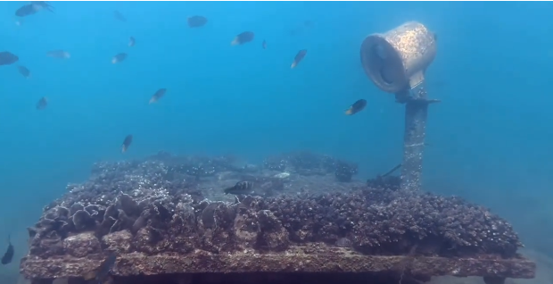 人工种植珊瑚附近架设的海底摄像头 | 广东海洋大学深圳研究院