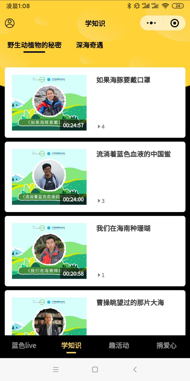 除此之外,你还能在直播界面中与志趣相投的小伙伴在线上交流;在“学知识”栏目中获得海洋知识;参加由中华环境保护基金会、桃花源生态保护基金会及其他环保公益机构组织的海洋相关体验活动;还可为环境保护项目提供爱心捐助。