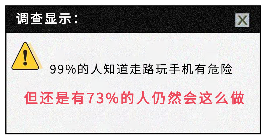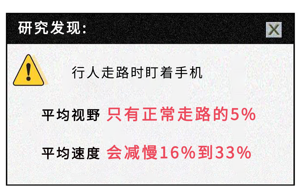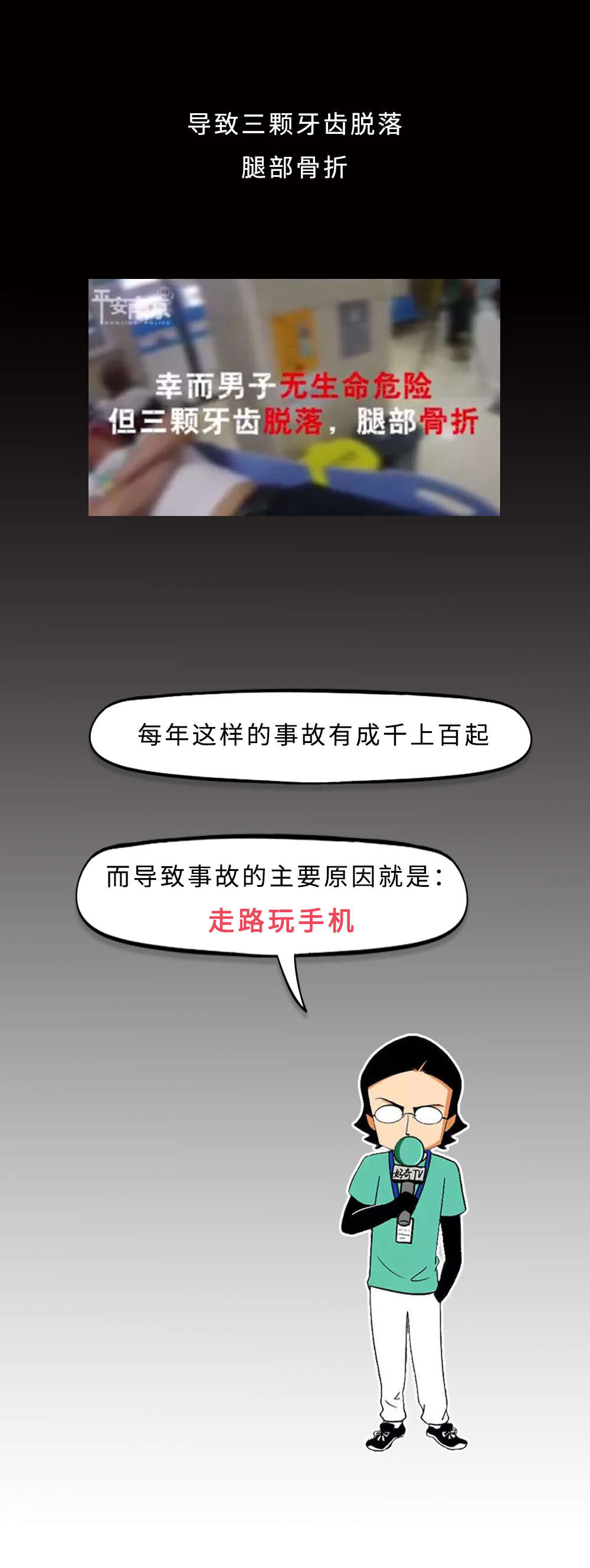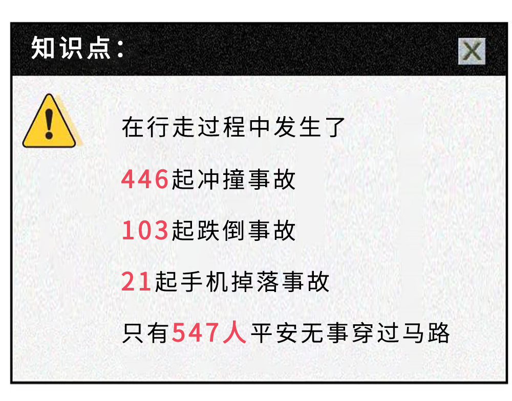 贵州一名装修工人边玩手机边上电梯电梯门开了但电梯却没到男子一脚踩空从30楼滑坠至8楼南京一男生沉迷玩手机竟从服务区走上了高速被民警发现后才回过神来如果没有被及时拦下,后果不堪设想上海男子坐地铁时低头看手机没注意到正在关闭的车门被卡进地铁屏蔽门和车厢之间安徽宿州一行人低头玩手机过马路被驶过来的轿车撞飞一名女子走路低头玩手机被迎面而来的一辆车撞倒还没等她反应过来随即又被对面开来的车碾压全身湖北17岁女生边走路边玩手机过桥时一脚踏空掉入没有护栏保护的10米高深坎经抢救无效死亡一个个鲜活的生命因为“走路玩手机”被葬送一小伙边走路边玩手机摔下4米深井等消防员赶来救援时他一边痛得呻吟,一边仍在玩手机就在几个月前日本某市打算制定“防止走路看手机条例”拟认定“走路看手机违法”消息一经传出就在中国上了微博热搜但在这条热搜下面的有些评论看得让人心惊有人说政府管得宽有人说这个规定有毛病甚至还有人说“做法有点过,人家看手机出事了自己扛”泰国一名女子边走路边看手机和一名骑车小伙发生碰撞骑车小伙翻倒在地被后面开来的游览车重重辗过4岁儿子在泳池溺水而亡他拼命挣扎了3分钟期间他的母亲就在旁边玩手机完全没有注意到儿子的呼救一女子走路玩手机导致一辆摩托车与自己碰撞摩托车上的乘客不幸死亡女子最终被判有期徒刑十个月赔偿被害人家属20万元日本曾做过一项关于走路玩手机的调查因为很多人都很自信地认为如果换做自己看手机时一定能兼顾看路危险来临时也一定能及时刹住车但事实真的如此吗?我们在玩手机的时候是无法兼顾看路的在心理学上有一个概念叫做“不注意视盲”通俗一点讲就是边走路边玩手机时你的大脑都在集中处理手机上的信息即使看到了危险来临你的大脑也来不及处理日本电信公司曾做过一次模拟测试在最繁华的东京街头如果每一个行人都盯着手机看会出现什么情况模拟人数为1500人结果显示针对这个数据我们完全可以这么说:走路玩手机发生事故是一个必然性事件只是时间早晚和运气的问题如果你不想等事故发生后再追悔莫及那就从现在开始放下手机吧! 博士一分钟,姿势涨不停 - 本期完 -我是好奇博士