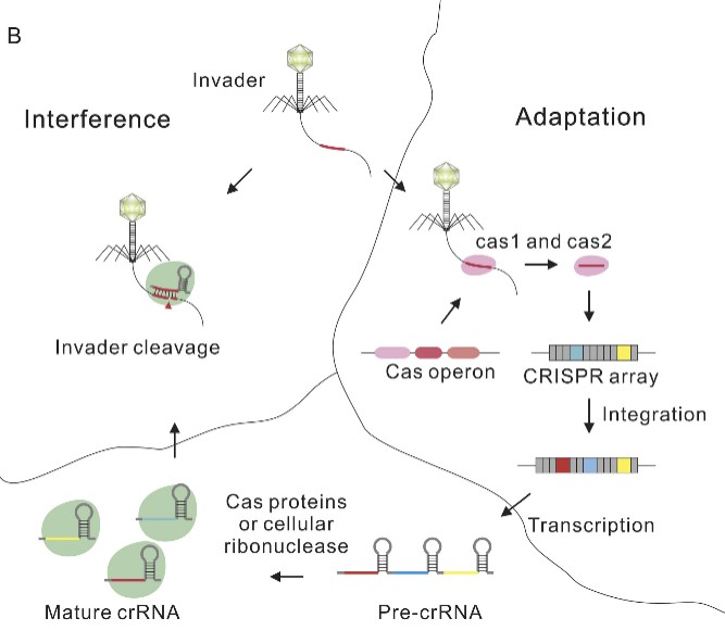CRISPR/Cas系统发挥作用需要三个步骤,首先,当入侵者首次侵入的时候,CRISPR系统就会捕获一段入侵者的基因序列,当作身份证明,这样就可以识别它了;接下来,由Cas1/Cas2将这段捕获好的序列整合到CRISPR的重复序列之间,这段用于识别身份的序列就叫间隔序列;最后,这段序列经过转录产生一段段带身份识别和引导功能的CRISPR RNA(crRNA),能够找到目标入侵者的DNA序列,通过与其进行识别互补后,就可以激活Cas9蛋白,把入侵者的DNA双链切断,让它失去功能。