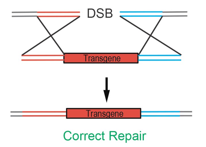 在将Cas9和工具载体一起转进细胞或注射到受精卵后,Cas9先对DNA在特定位置进行切割(绿色标记处),形成DNA双链断裂(DSB)。然后再把载体连着同源臂这一段也切下来,目标基因两端红色和蓝色同源臂与改造DNA相互识别,发现他们竟然是一样的!那一样的当然可以互补配对连在一起。这样在修复了DNA断裂的同时,也就把目的基因整合在基因组上了。